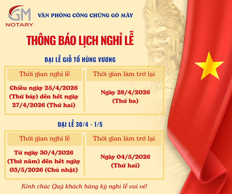 Văn phòng Công chứng Gò Mây trân trọng gửi đến Quý khách hàng lịch nghỉ lễ như sau: